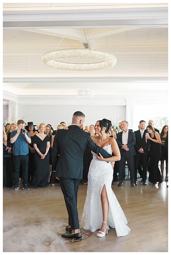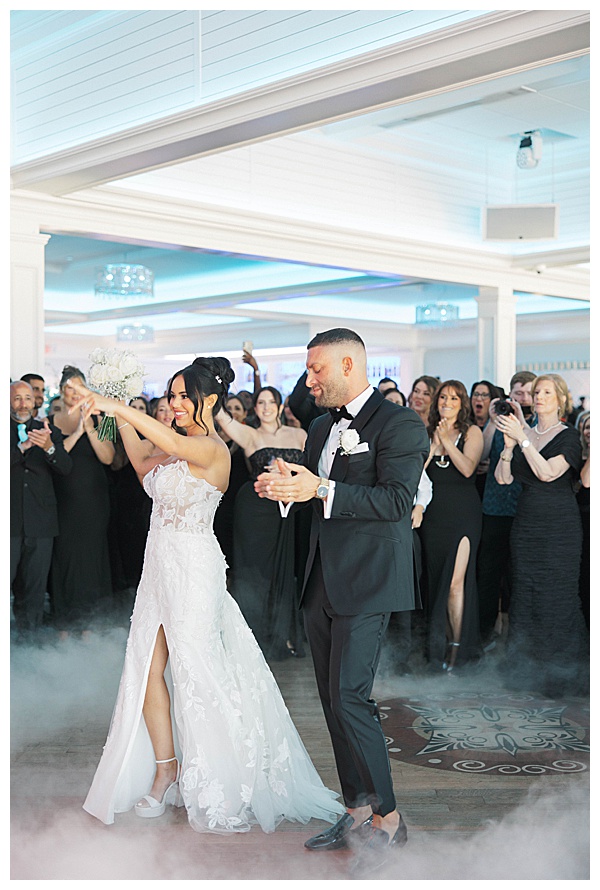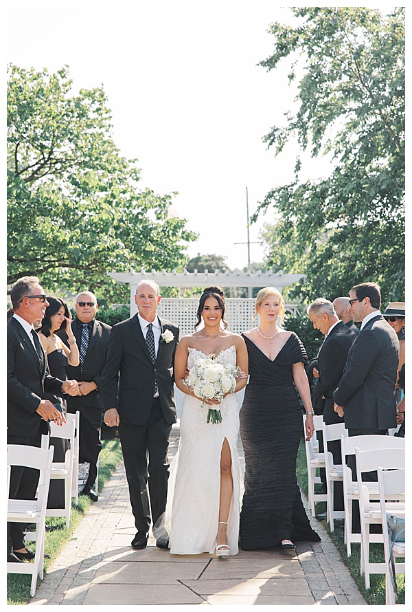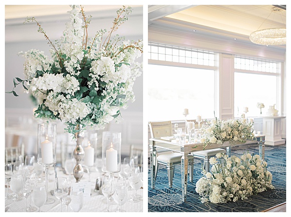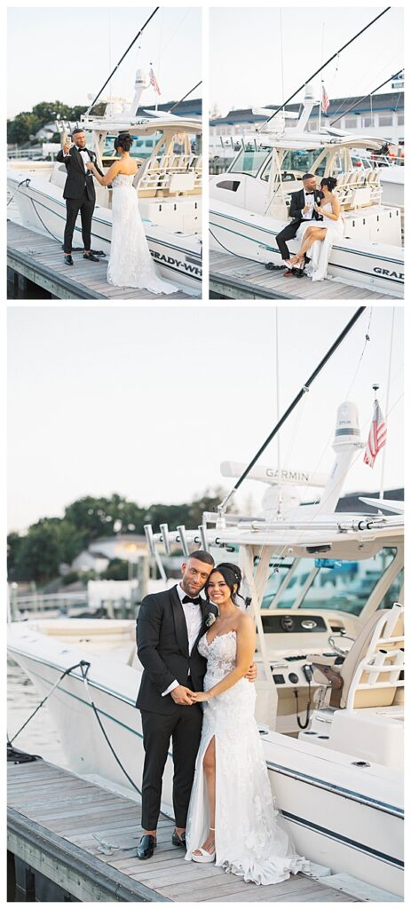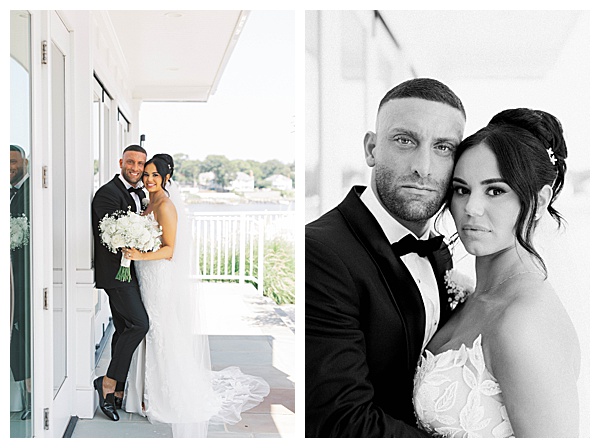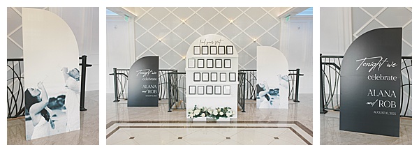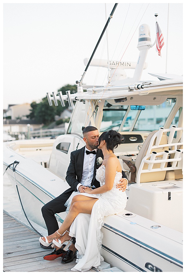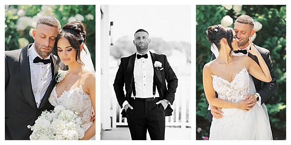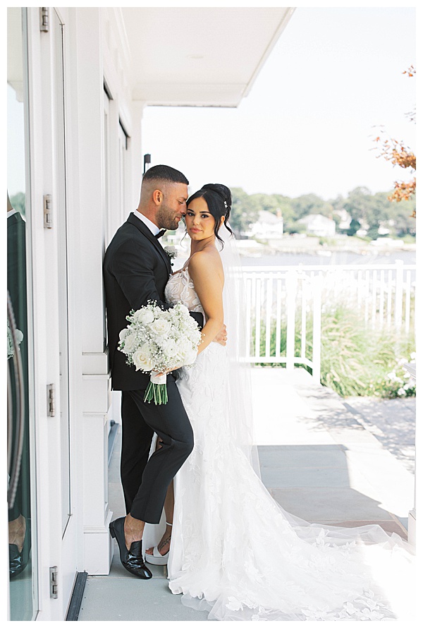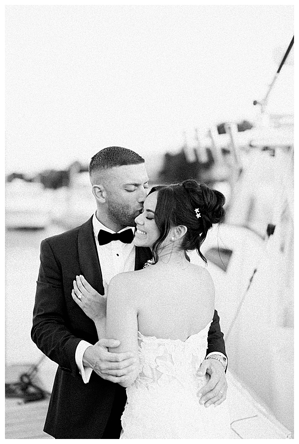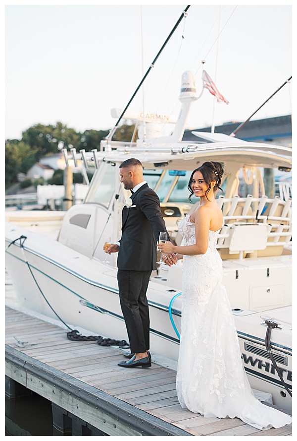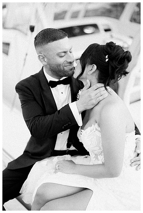 With the sun shining high and the river sparkling in the background, Crystal Point Yacht Club created the perfect coastal setting for their celebration. Alana chose a timeless look, complemented by a small bridal party dressed in sleek black bridesmaid dresses, while Rob and his groomsmen wore sharp black tuxedos that added to the clean, classic feel of the day. The neutral color palette fit beautifully with the waterfront scenery and gave everything a modern, elegant edge.