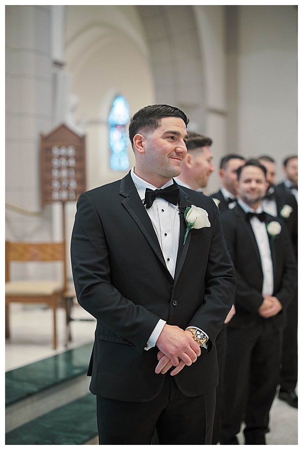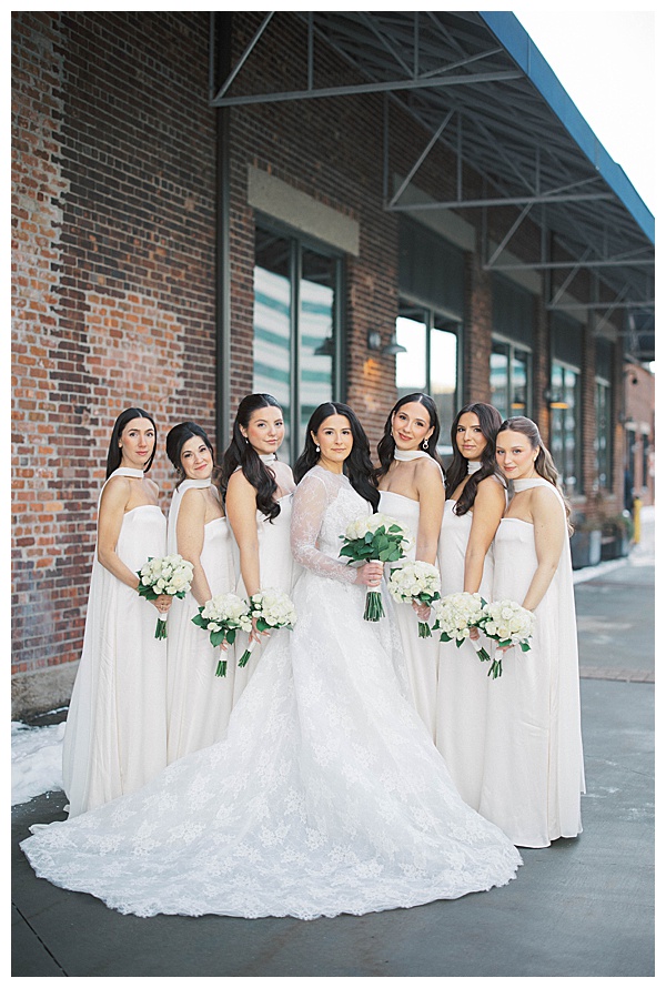 The ceremony took place at St. Theresa Avila in Summit, providing a stunning backdrop for their elegant winter photos. The church’s architecture and soft winter light created a romantic, almost ethereal atmosphere. Stephanie’s minimalistic vision was flawless—her bridesmaids in modern white silk dresses, the space glowing with candlelight, and every detail carefully curated to feel chic and timeless.