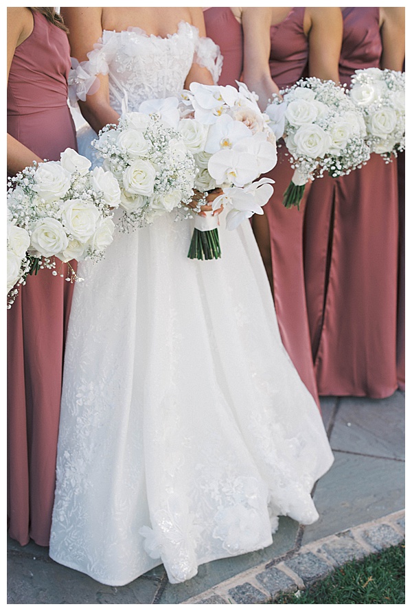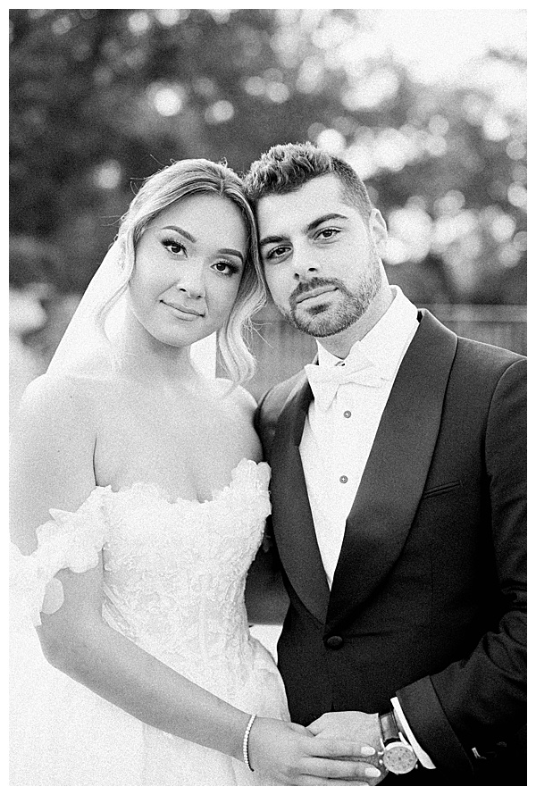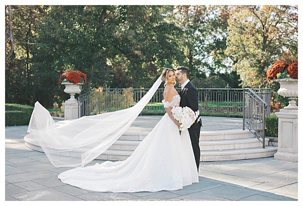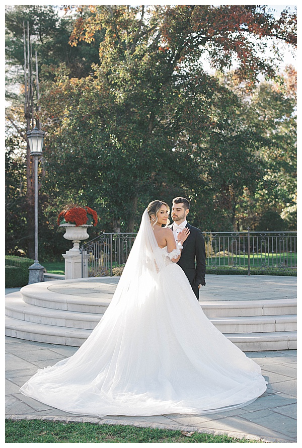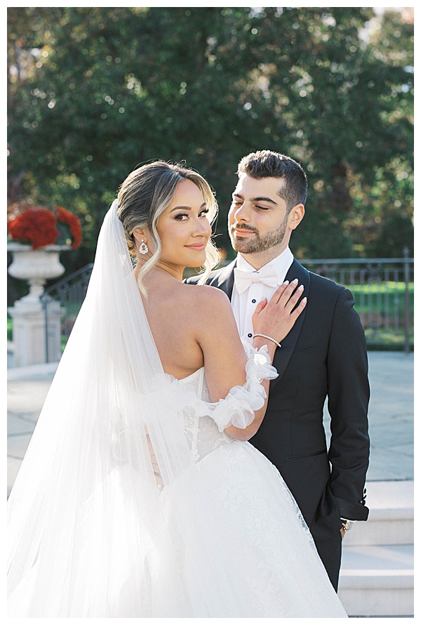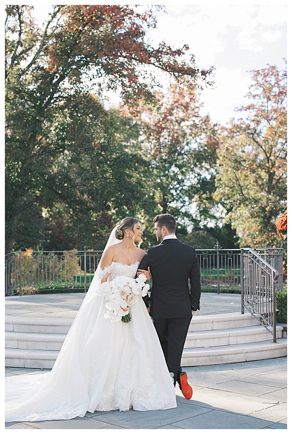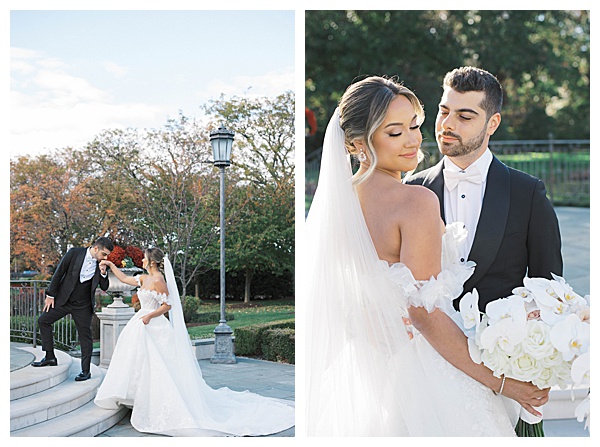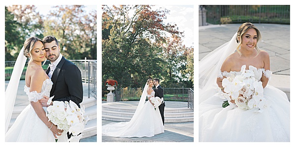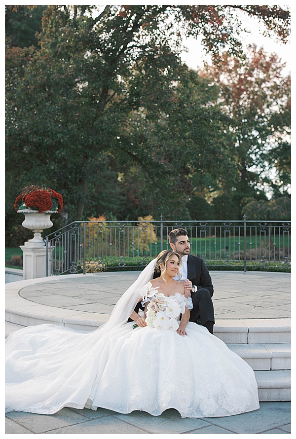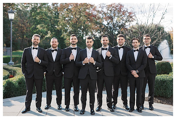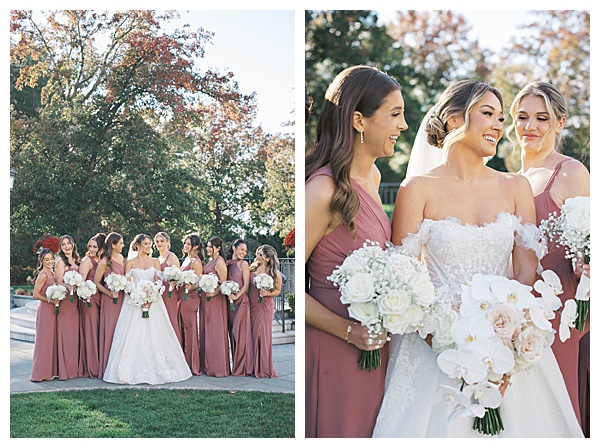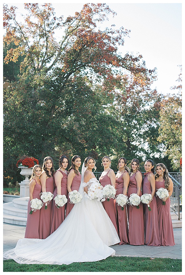 After the ceremony, the celebration continued at their Park Chateau NJ wedding, and the setting was nothing short of breathtaking. The gardens were glowing in the October sunlight, creating a timeless backdrop for portraits. Emma and Ralph looked completely at ease together, laughing and soaking in every moment. The bridesmaids wore a rich deep mauve that added warmth and contrast, while the groomsmen kept things classic in black tuxes.