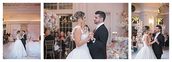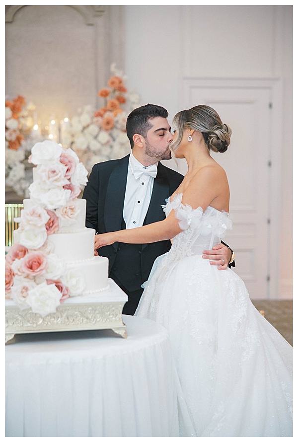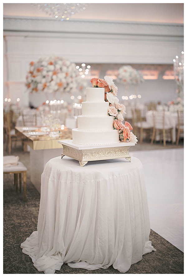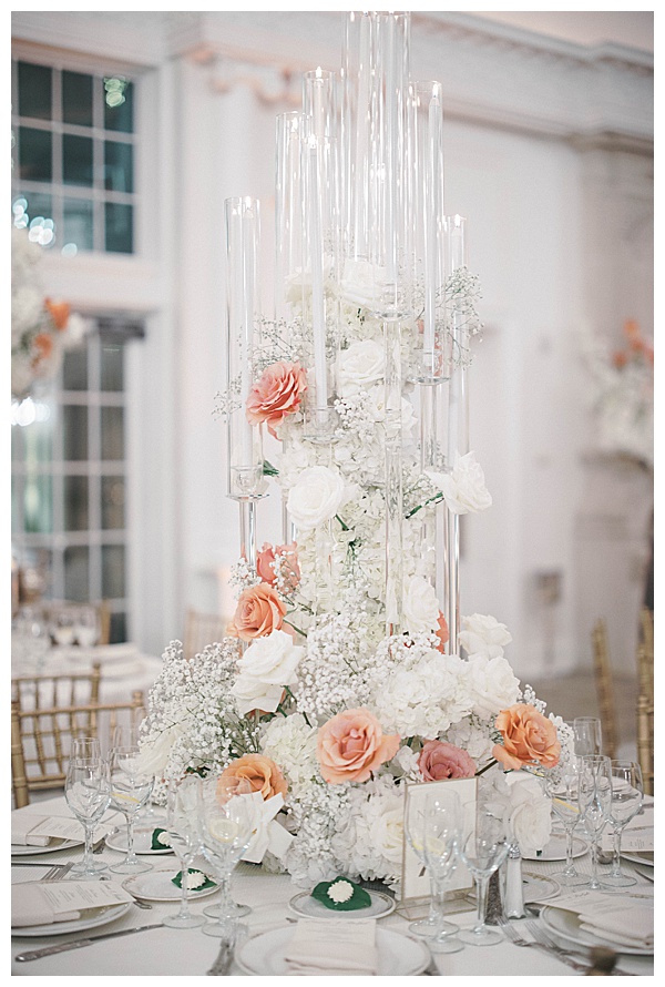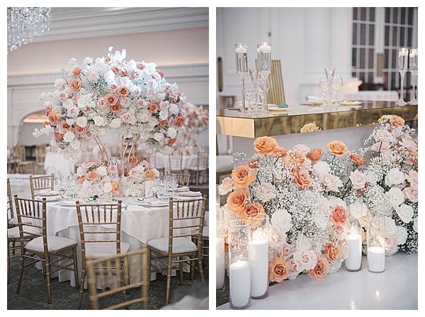 Inside, the reception space was elegant and full of life. A white dance floor anchored the room, surrounded by an abundance of florals in white, peach, and soft light pink. Instead of leaning into bold fall colors, the design felt light, romantic, and effortlessly beautiful. When Emma and Ralph made their grand entrance, Arabic drummers filled the room with energy and excitement, instantly setting the tone for the night.